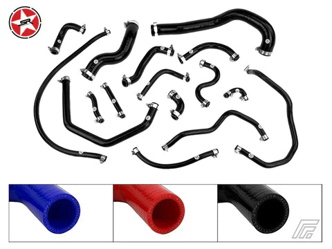 This high quality reinforced silicone hose kit replaces 16 coolant and breather hoses in the engine bay listed below.